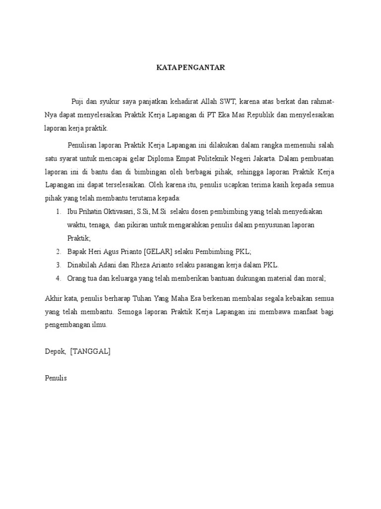 Kata pengantar sebaiknya ditulis menggunakan bahasa . Contoh kata pengantar laporan pkl; Kata pengantar biasanya terdapat pada skripsi, proposal, laporan, karya ilmiah dan makalah. Contoh kata pengantar karya ilmiah; Berikut materi lengkap tentang kata pengantar, mulai dari tujuan, struktur, & contoh kata pengantar makalah, laporan, proposal, skripsi atau karya ilmiah.