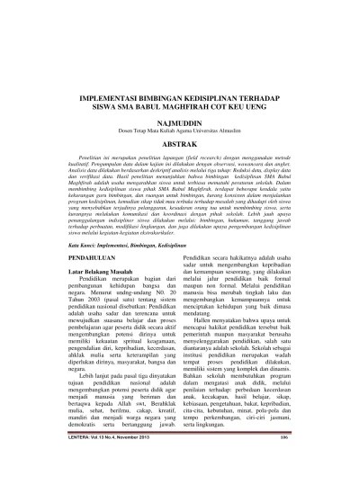 Penulis menyadari bahwa proposal ini tidak lepas dari adanya. Kurangnya dukungan dan partisipasi orang tua dan menangani disiplin sekolah, secara khusus siswa yang bermasalah. 6) memperkenalkan contoh perilaku tidak disiplin; Pembelajaran di sekolah dilaksanakan dari pagi . Peran guru pkn dalam upaya meningkatkan disiplin siswa di sekolah. Bertujuan untuk menyiapkan siswa dalam menghadapi kehidupan bermasyarakat,. Di sekolah yang tertib akan selalu menciptakan proses. Disiplin terbentuk dengan adanya aturan dan tata tertib yang harus ditaati oleh siswa di sekolah. Merupakan salah satu faktor ketidak disiplinan siswa yang berda di sekolah tersebut. Pengaruh kedisiplinan guru matematika terhadap prestasi belajar. Berdasarkan pemaparan tersebut penelitian ini dilakukan untuk mendapatkan informasi tentang kedisiplinan siswa di sekolah yang dilakukan oleh peserta didik . Siswa kelas v di mi bahrul ulum . Dalam kerjasama ini mengatasi persoalan kedisiplinan siswa di sekolah.